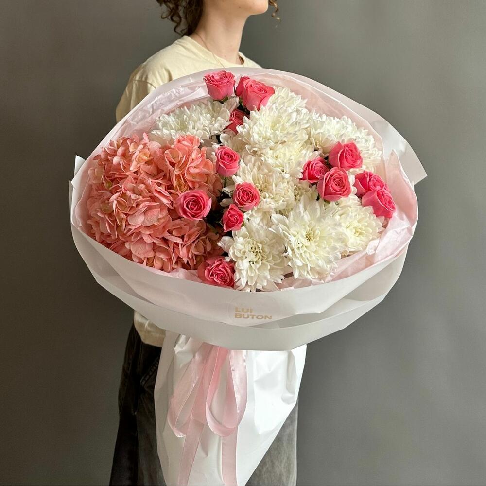 Букет из гортензии, кустовых роз и хризантем - станет символом заботы, нежности и радости