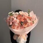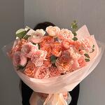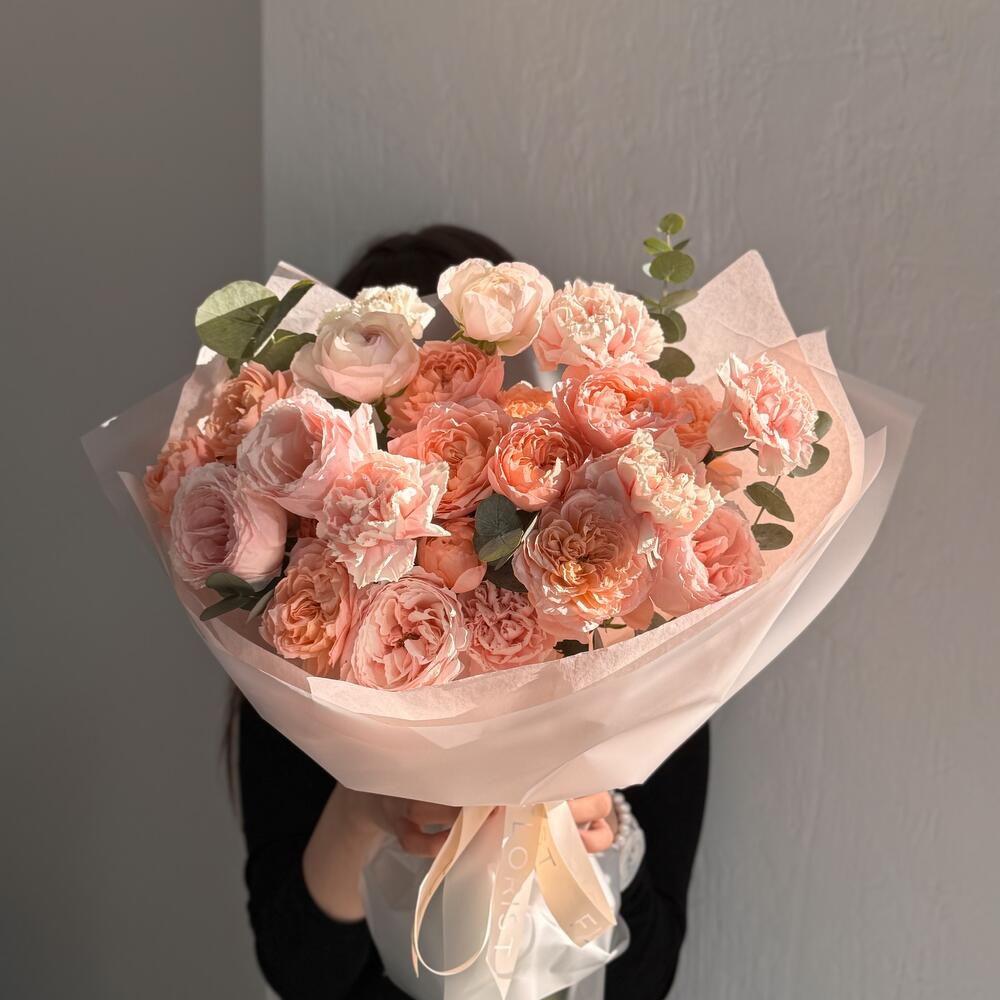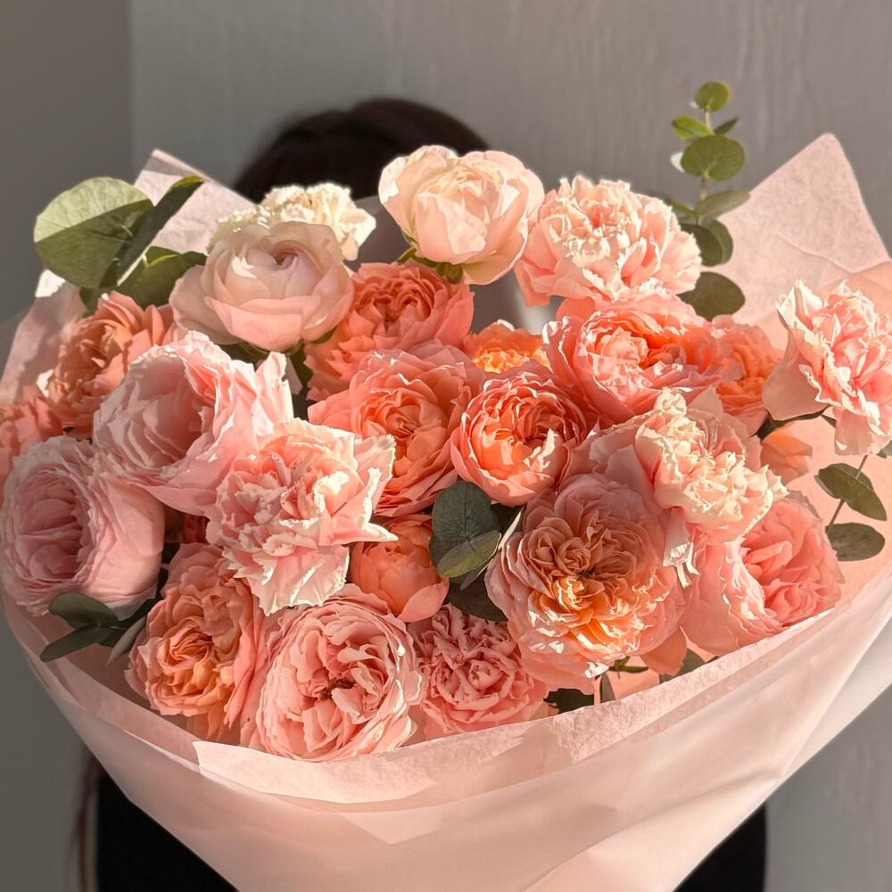 Eucalyptus - 1 pcs Dianthus - 5 pcs Peony - shaped rose - 3 pcs bush rose juliet - 3 pcs