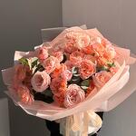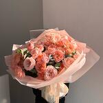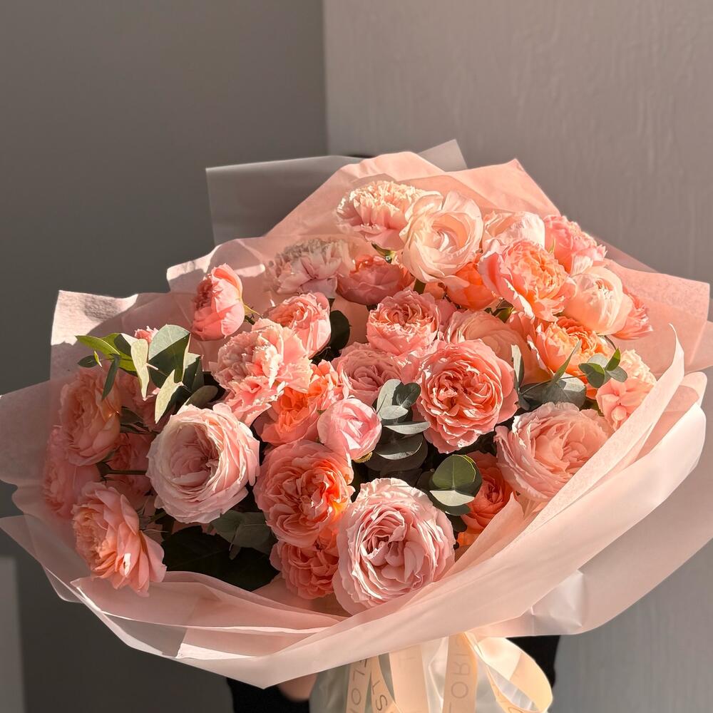 Eucalyptus - 1 pcs Ranunculus - 3 pcs Peony - shaped rose - 3 pcs bush rose juliet - 5 pcs Author's packaging - 1 pcs dianthuses - 5 pcs aquabox with water - 1 pcs vitamins for flowers (crystal) - 1 pcs