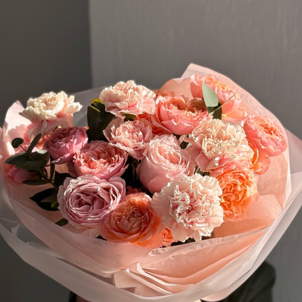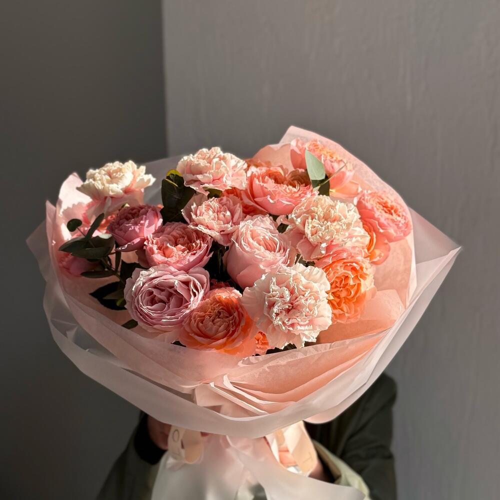 Eucalyptus - 1 pcs Dianthus - 4 pcs Peony - shaped rose - 2 pcs bush rose juliet - 2 pcs