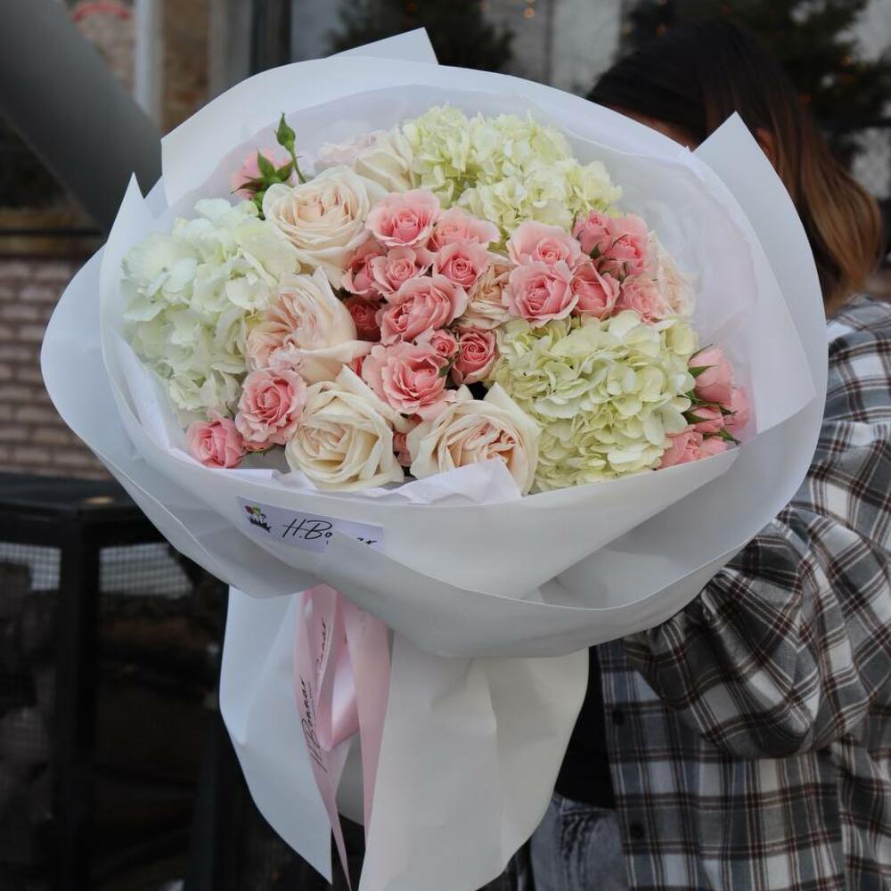 Роскошный букет из гортензий, охар и спрей-роз.