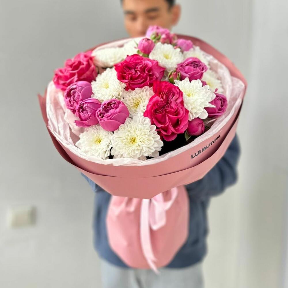 Букет из пионовидных роз, хризантем и кустовых пионовидных роз - мягкие оттенки данного букета делают его особенно трогательным и женственным