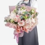 Bouquet with hydrangea "More Delicate than Delicate" L consists of Hydrangea 3, Spray rose 6, Lisianthus 5, Peony-shaped rose 7, Eucalyptus 4, Packaging. What could be more delicate than a bouquet with airy hydrangea combined with soft-pink peony-shaped roses, white lisianthus and pink spray roses? Chances are you won't find a more delicate combination in nature. This cascading bouquet is created for true ladies, gentle and refined. Delight your beloved with the most delicate bouquet in the world and let the flowers tell of your sincere feelings. *peony-shaped roses may be replaced with an equivalent product