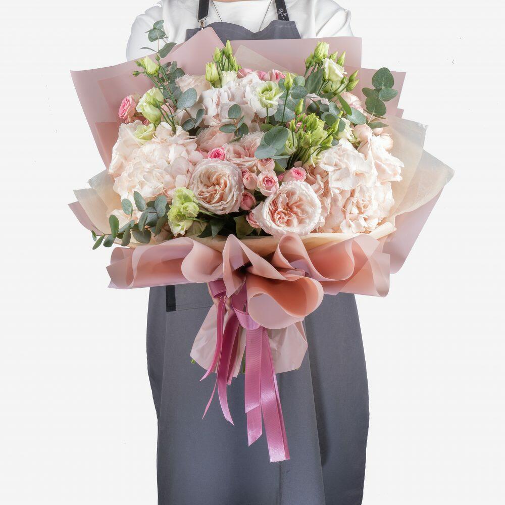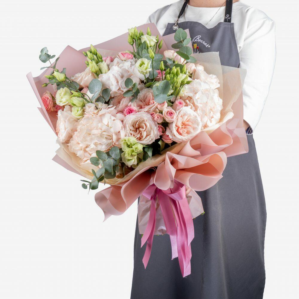 Bouquet with hydrangea "More Delicate than Delicate" L consists of Hydrangea 3, Spray rose 6, Lisianthus 5, Peony-shaped rose 7, Eucalyptus 4, Packaging. What could be more delicate than a bouquet with airy hydrangea combined with soft-pink peony-shaped roses, white lisianthus and pink spray roses? Chances are you won't find a more delicate combination in nature. This cascading bouquet is created for true ladies, gentle and refined. Delight your beloved with the most delicate bouquet in the world and let the flowers tell of your sincere feelings. *peony-shaped roses may be replaced with an equivalent product