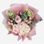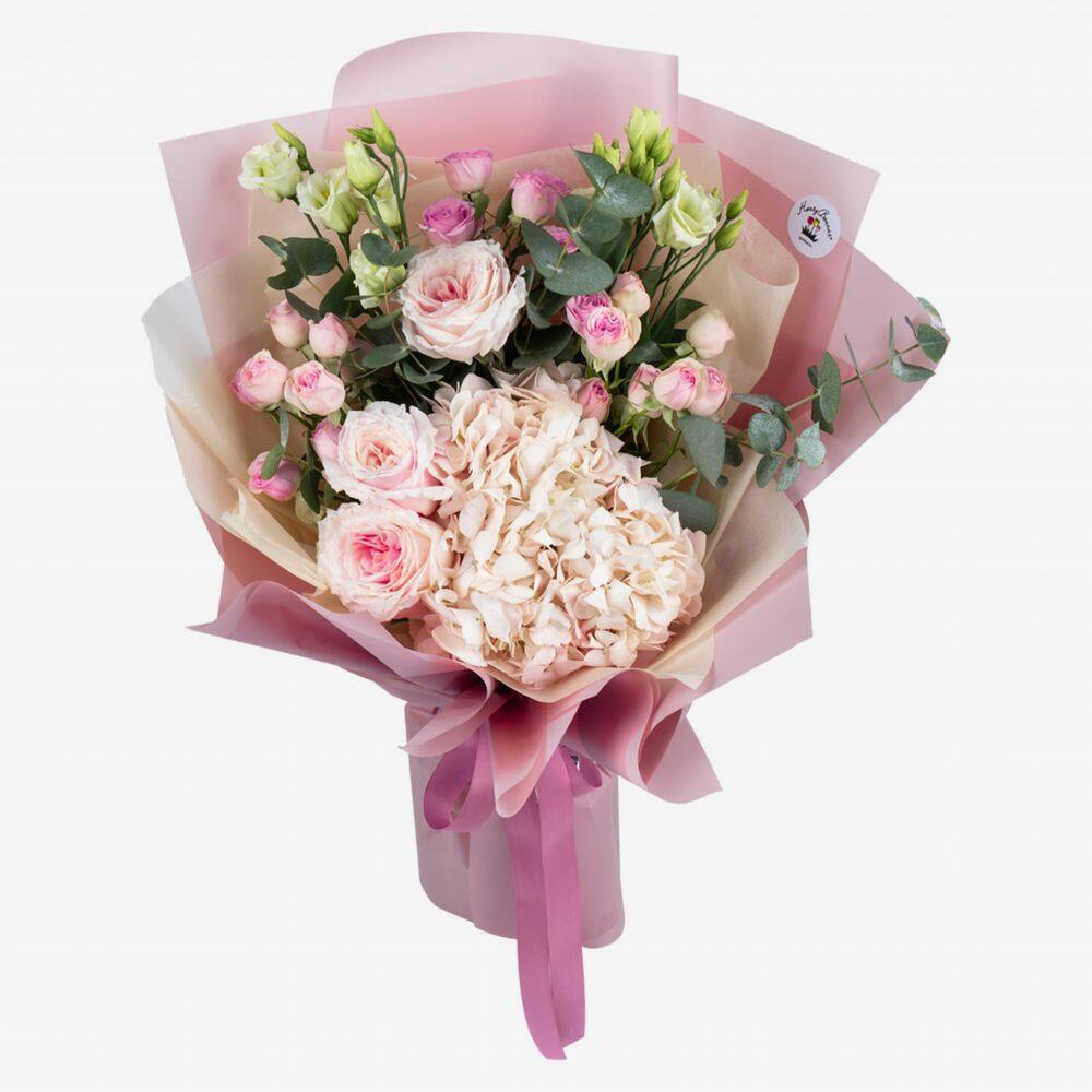 Bouquet with hydrangea "Tenderer Than Tender" S consists of Hydrangea 1, Spray rose 3, Lisianthus 2, Peony-shaped rose 3, Eucalyptus 3, Packaging. What could be more delicate than a bouquet with airy hydrangea combined with pale-pink peony-shaped roses, white lisianthus and pink spray roses? Surely you won't find a more delicate combination in nature. This bouquet in a cascading arrangement is created for true ladies, gentle and refined. Delight your beloved with the most delicate bouquet in the world and entrust the flowers to tell of your sincere feelings. *Peony-shaped roses may be replaced with an equivalent item