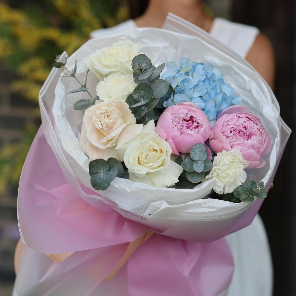 Hydrangea - 1 pcs Peony - 2 pcs Eucalyptus - 5 pcs Rose - 3 pcs Dianthus - 2 pcs