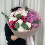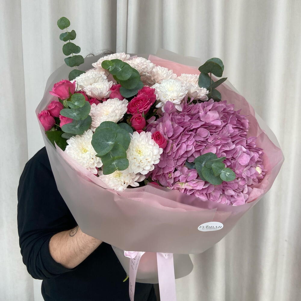 Hydrangea - 1 pcs Chrysanthemum bush - 3 pcs Eucalyptus - 1 pcs Bush rose - 2 pcs Packaging - 1 pcs