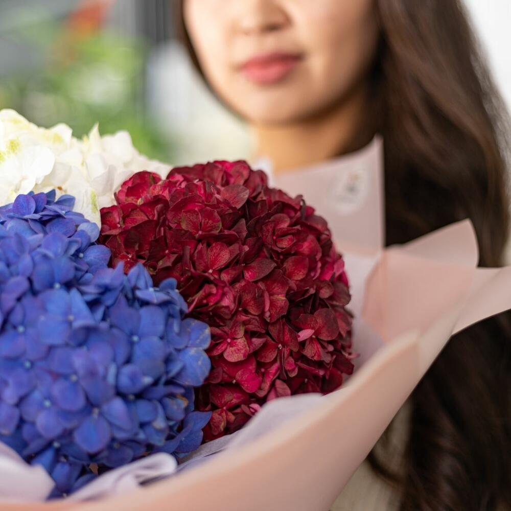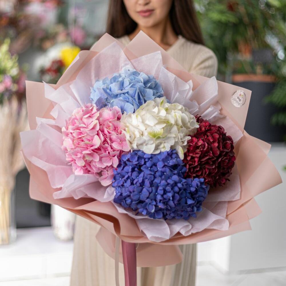 БУКЕТ С разноцветными ГОРТЕНЗИЯМИ S состоит из Гортензия 5, Декоративная лента , Упаковка. Нежный букет из разноцветных гортензий. Этот превосходный букет подойдёт для подарка, как вашей любимой, так и для коллеги. Так же по Вашему усмотрению мы можем вместе сымпровизировать с цветом композиции, оформлением, либо можем сделать букет более пышным и роскошным. * цвет гортензии может отличаться от фотографии