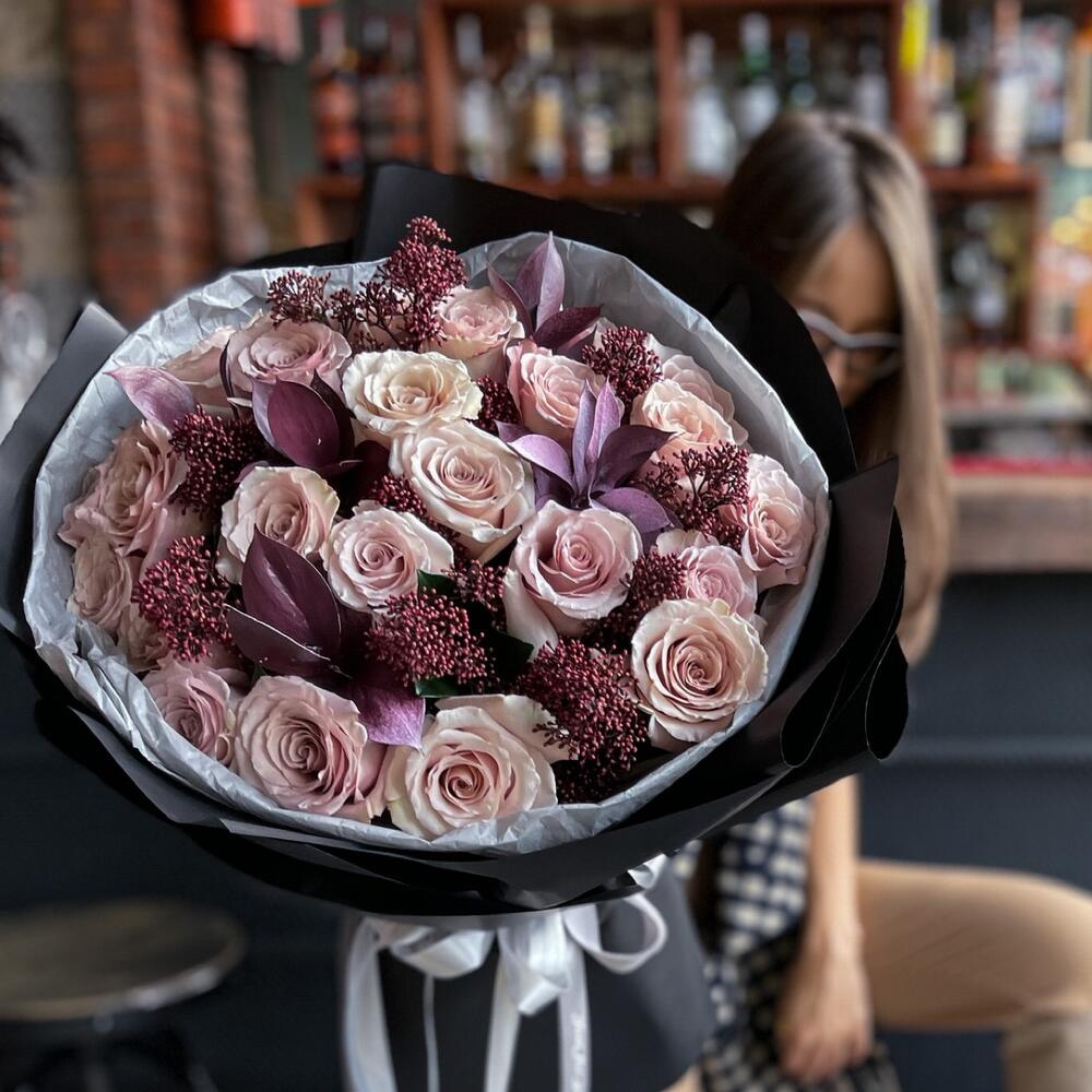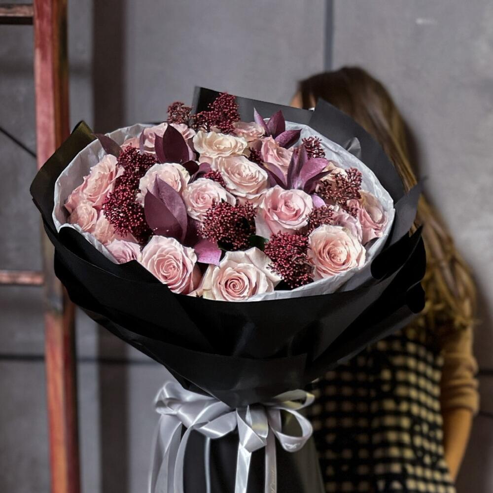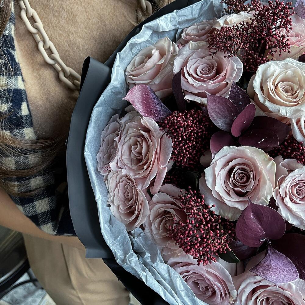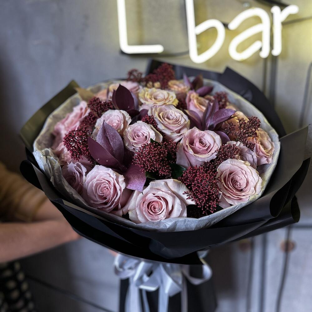 Skimmia - 5 pcs Author's packaging - 1 pcs roses 40 cm - 19 pcs