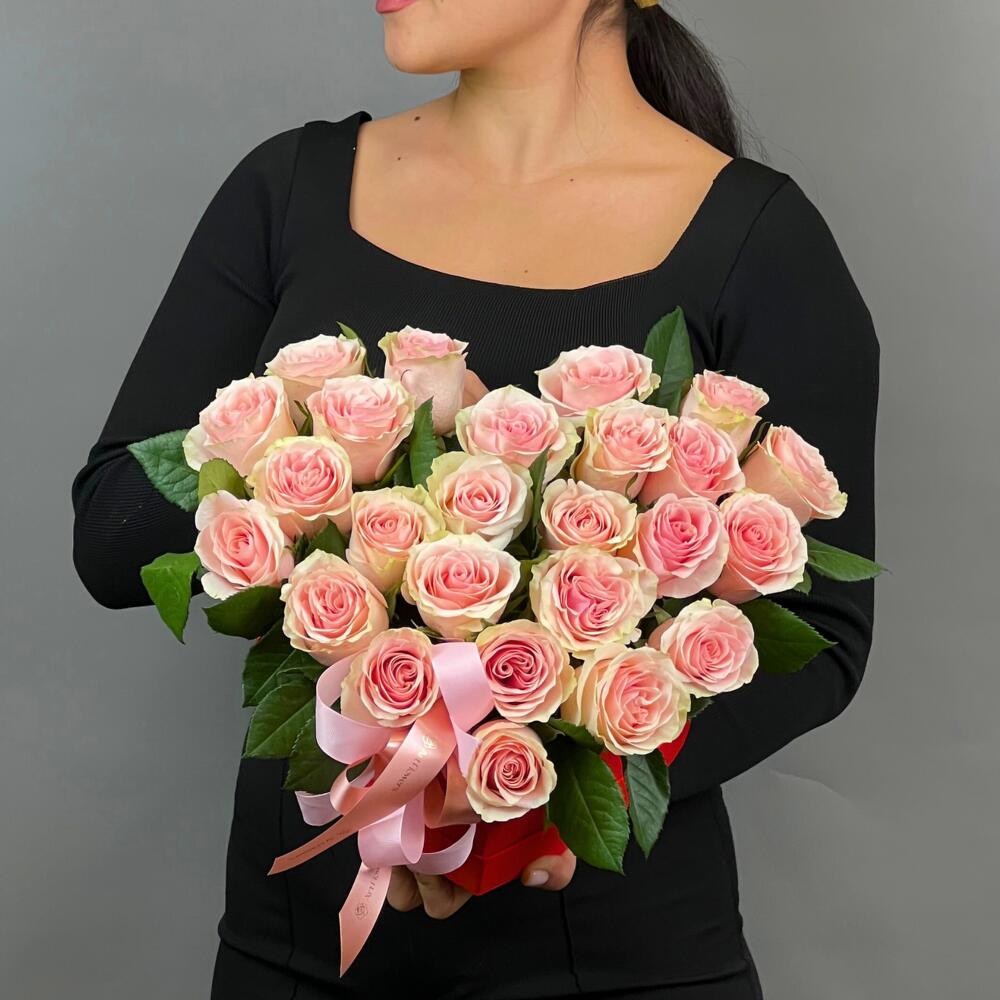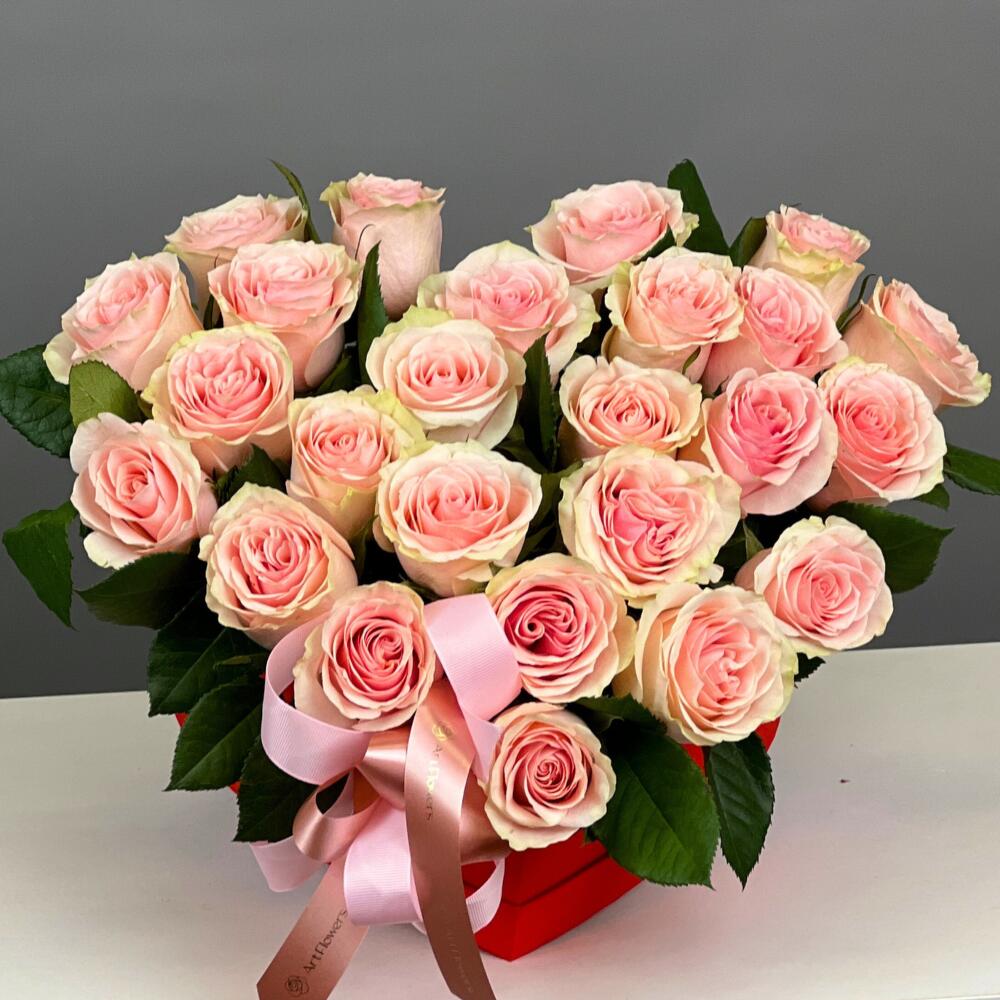 Воздушная композиция в форме сердца из розовых цветов. Подчеркните вашу заботу и любовь этим трогательным и стильным подарком.