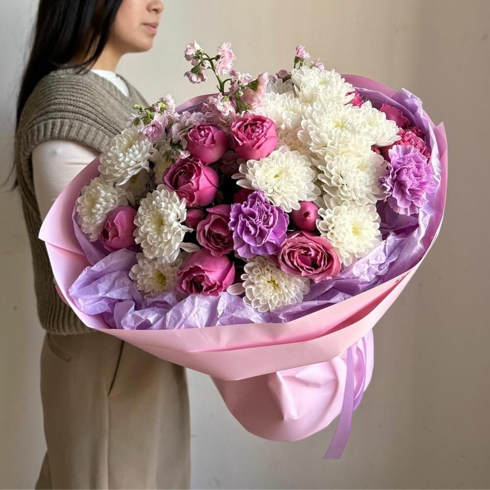 Нежный букет из кустовых пионовидных роз, хризантем, диантуса и маттиолы в гармоничных оттенках — символ внимания, заботы и теплоты. Такой букет дарит эмоции и остаётся в памяти надолго