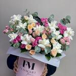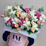 Букет в коробке с кустовыми розами «Сильва пинк», кустовыми розами «Бомбастик», обрамленными розой и эвкалиптом. Этот микс красок и форм создает невероятный визуальный праздник, словно волшебная история в каждой ячейке коробки.