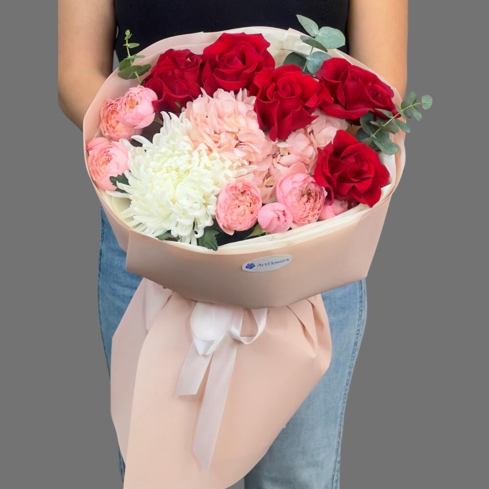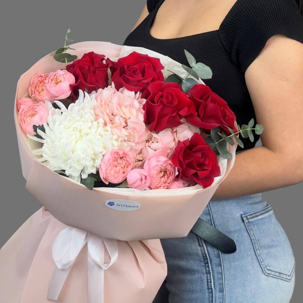 Hydrangea - 1 pcs Eucalyptus - 1 pcs Rose - 5 pcs Chrysanthemum - 1 pcs roses juliet - 2 pcs