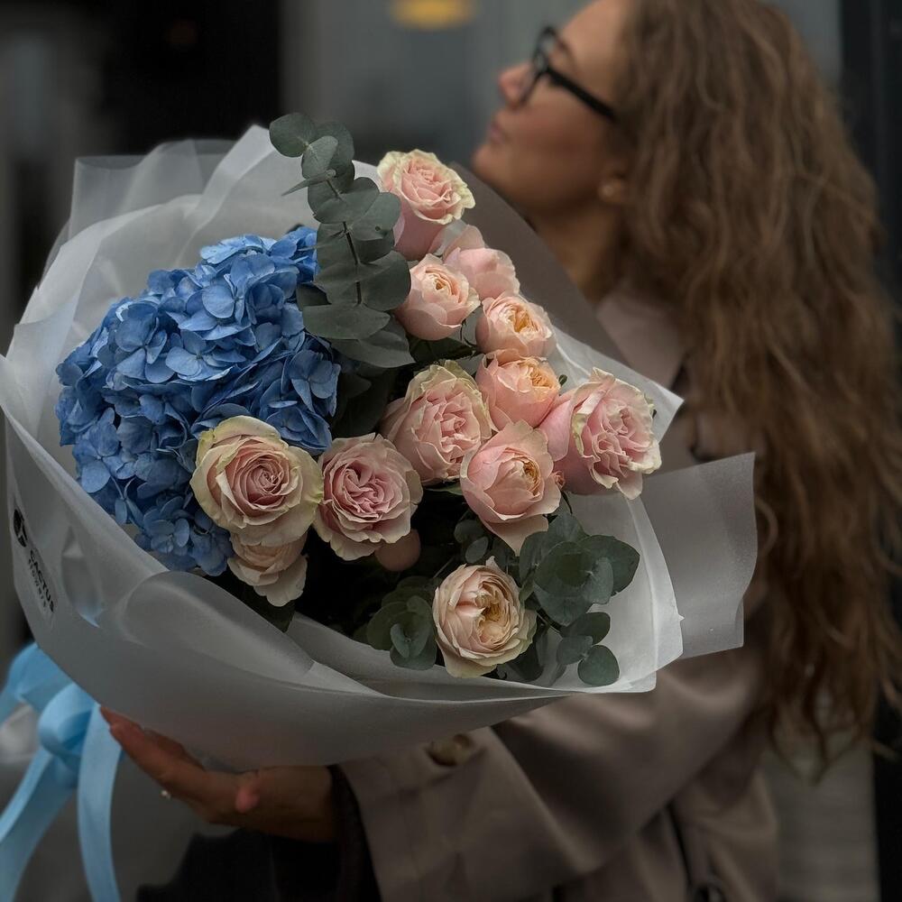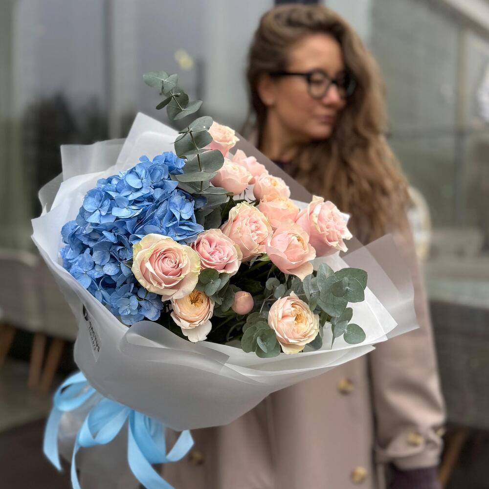 Авторский букет с голубой гортензией и пионовидными сортами роз