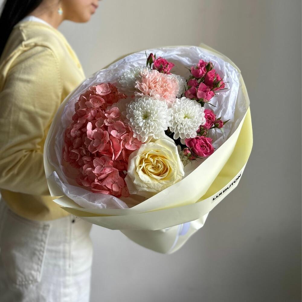 Hydrangea - 1 pcs Chrysanthemum - 1 pcs Dianthus - 1 pcs Peony - shaped rose - 1 pcs bush roses - 2 pcs