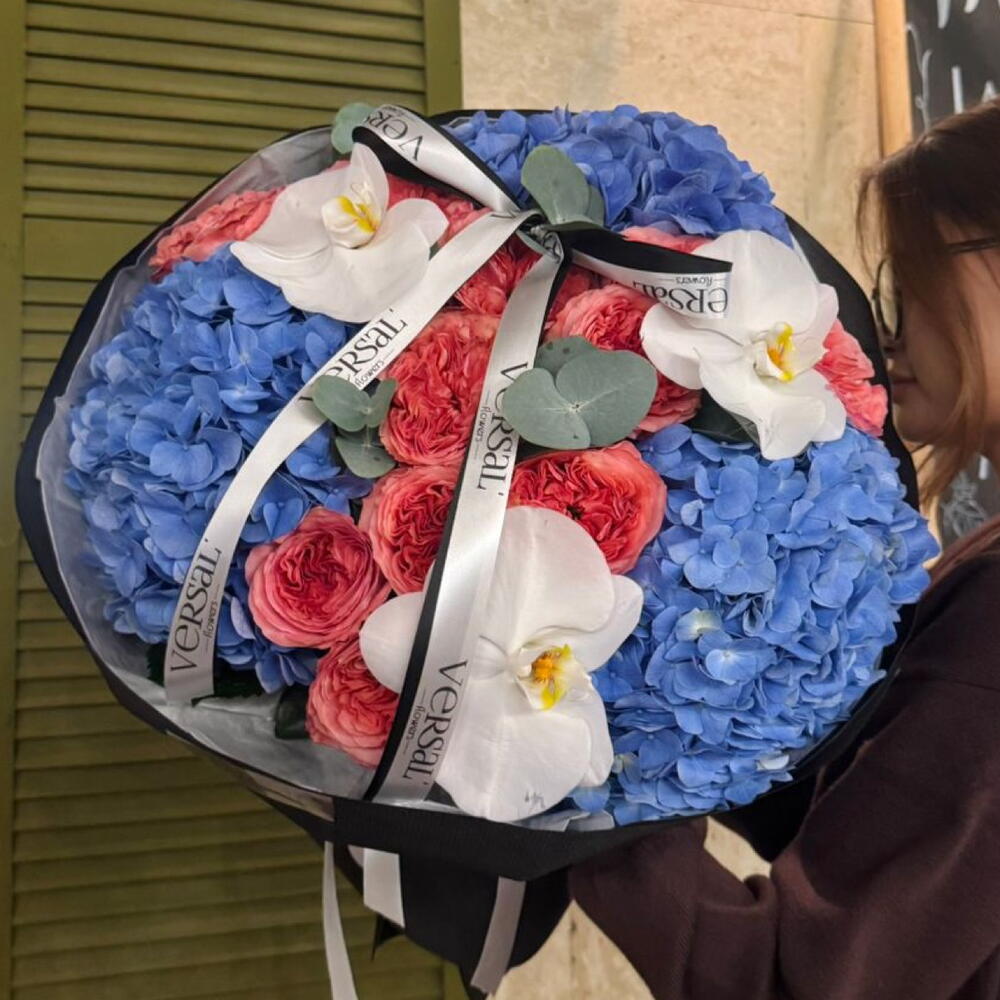 Eucalyptus - 1 pcs Peony bush rose - 13 pcs orchid - 3 pcs hydrangeas - 3 pcs aqua paper - 1 pcs