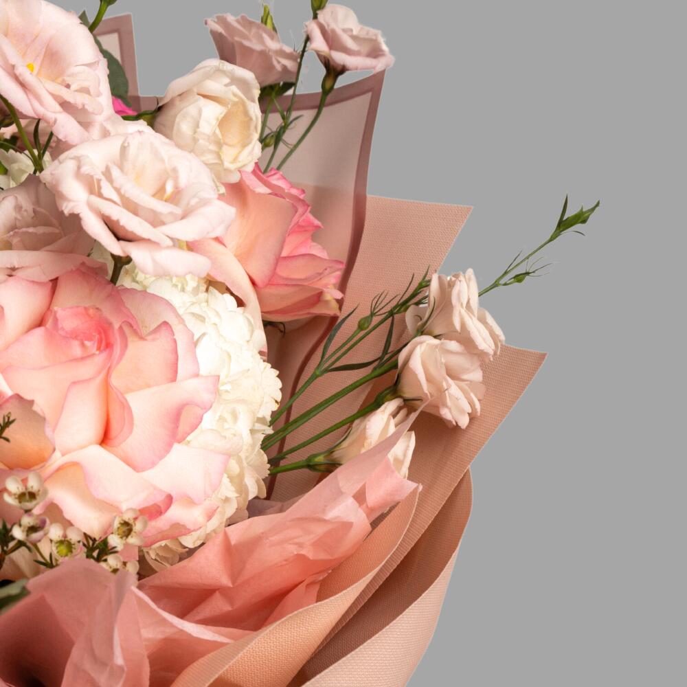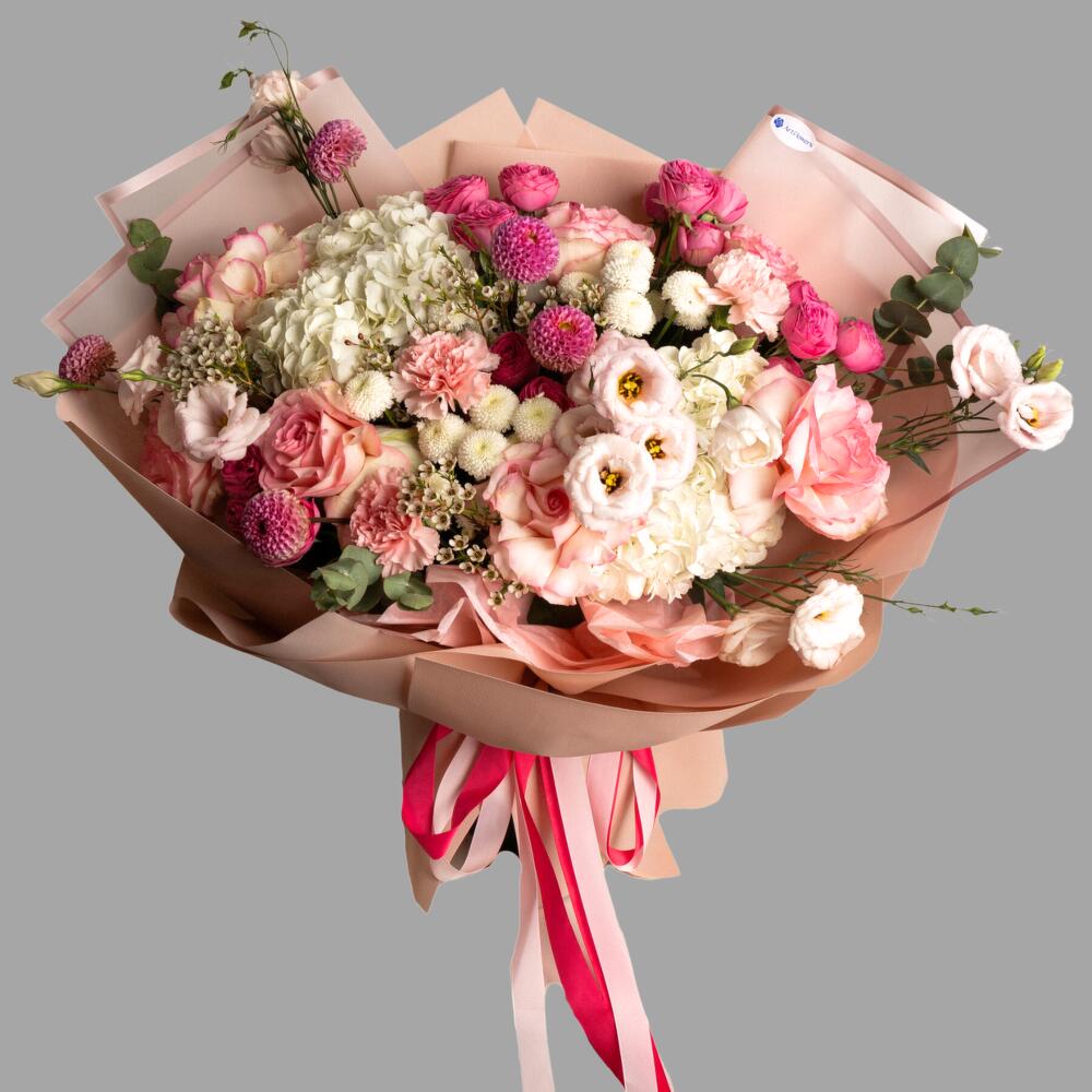 Waxflower - 2 pcs Hydrangea - 2 pcs Lisianthus - 5 pcs Chrysanthemum bush - 3 pcs Eucalyptus - 2 pcs Rose - 7 pcs Chrysanthemum - 5 pcs carnations - 3 pcs dahlias - 5 pcs спрей розы джульетта - 5 pcs