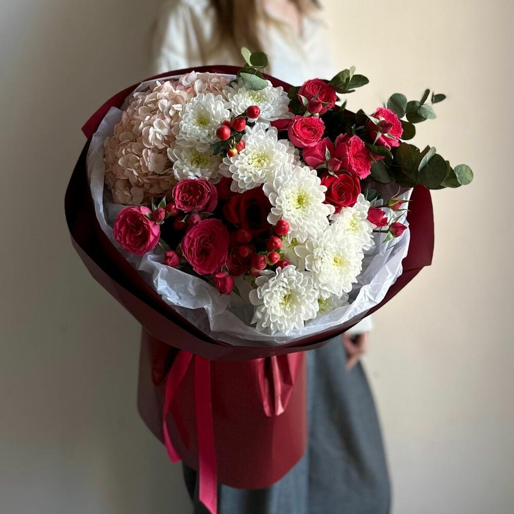 Букет из гортензии, кустовых роз, хризантем, гиперикума и эвкалипта - отличный подарок для тех, кто любит стиль и красоту