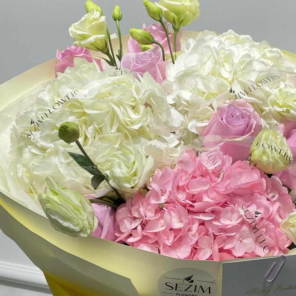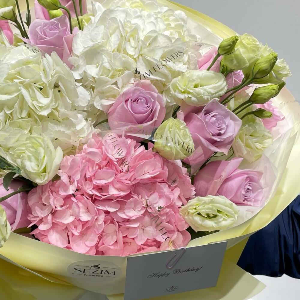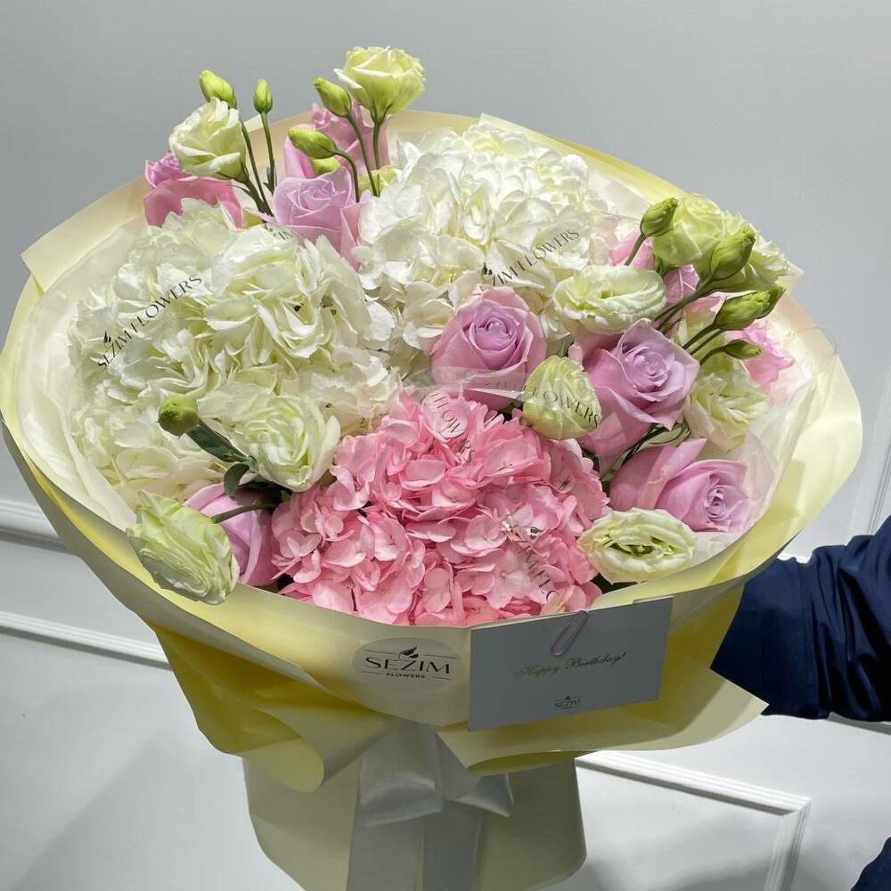 Hydrangea - 3 pcs Rose - 7 pcs Eustoma - 3 pcs