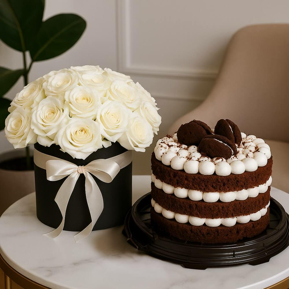 Букет свежих роз в стильной упаковке и нежный торт с воздушным бисквитом и сливочным кремом — идеальный подарок, чтобы выразить свои чувства и порадовать близкого человека.