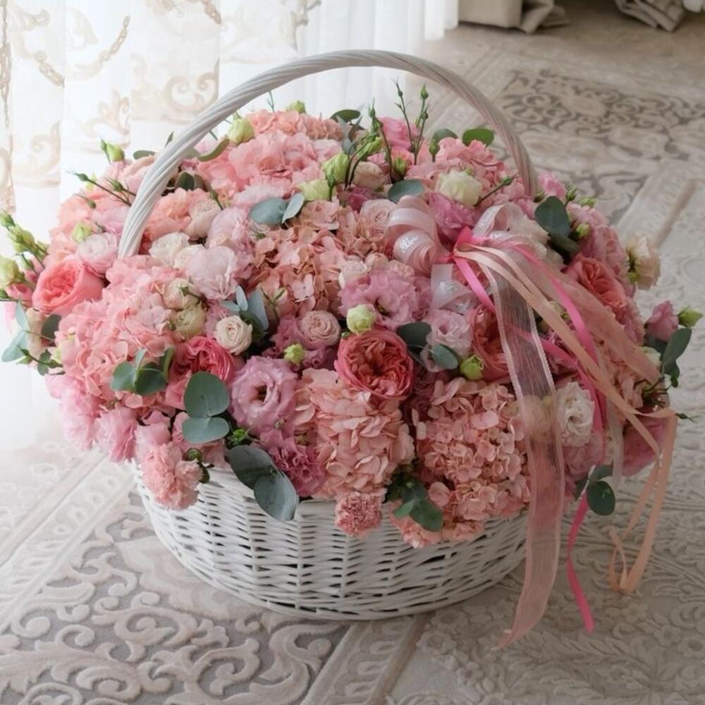 Hydrangea - 25 pcs Eucalyptus - 10 pcs Basket wicker - 1 pcs A postcard with your wishes - 1 pcs peony - shaped roses - 25 pcs eustoma - 25 pcs