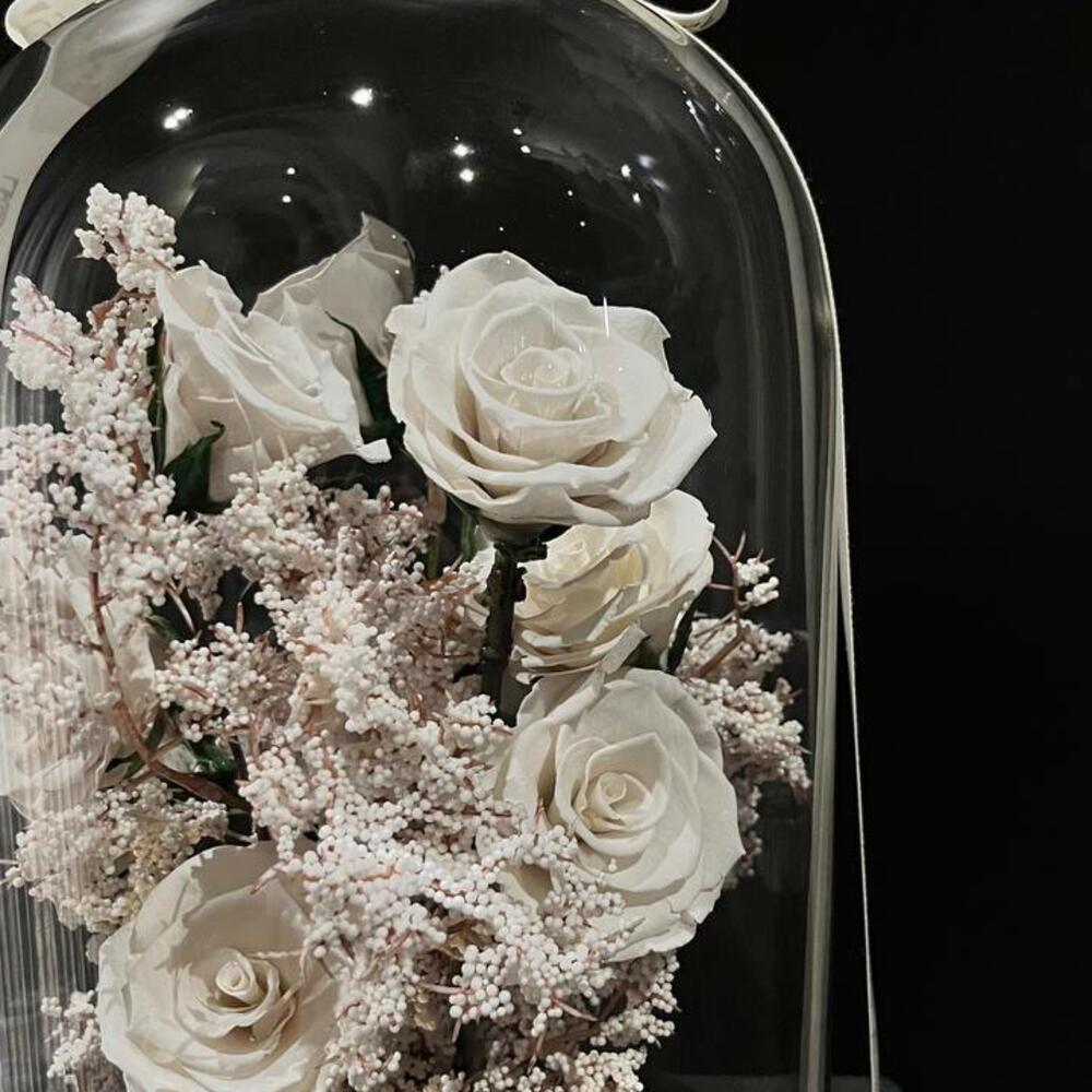 Glass flask - 1 pcs white stabilized roses - 5 pcs белые заснеженные искуственные ветви - 3 pcs