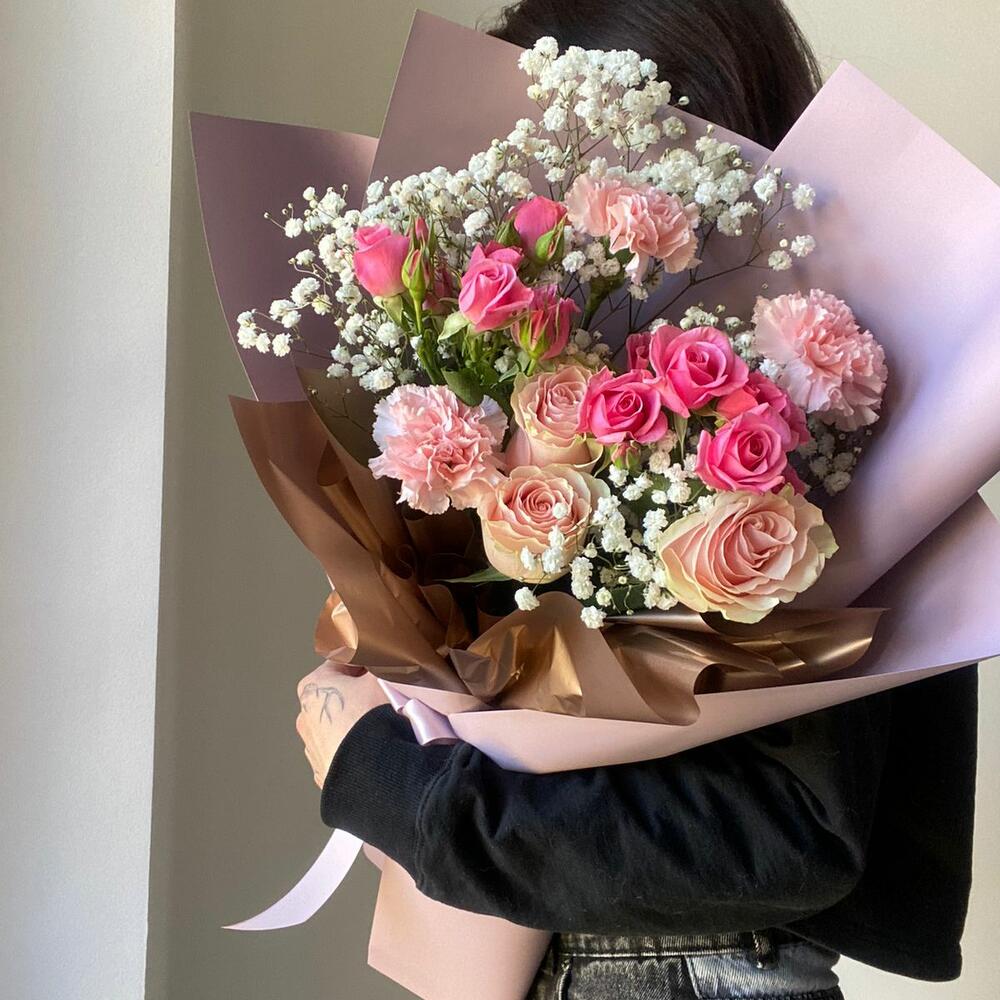 Gypsophila - 2 pcs Rose - 3 pcs Bush rose - 2 pcs Carnation - 3 pcs