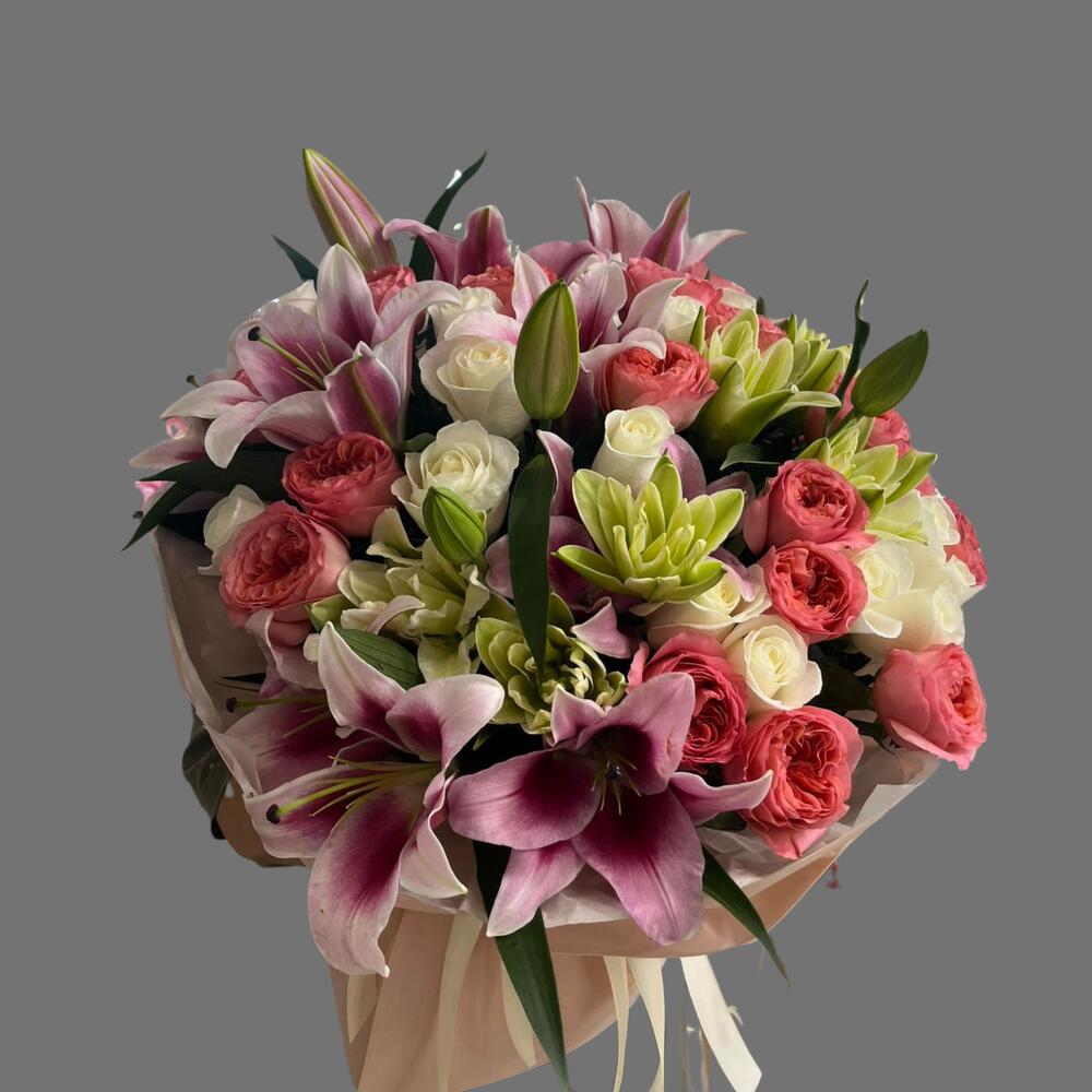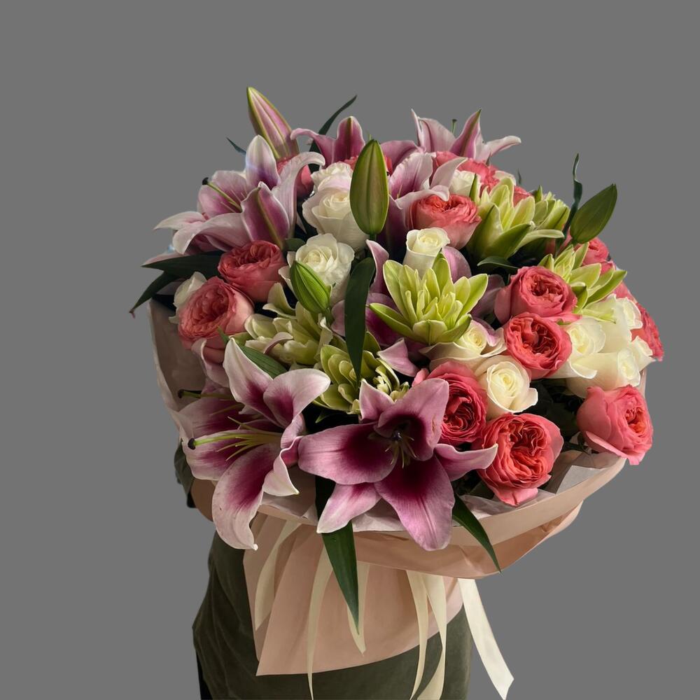 Яркий и насыщенный букет, в котором соединились благородство роз, нежность азиатских лилий и царственная красота королевских. Для тех, кто любит масштабные эмоции.