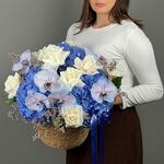 Букет в морской палитре, будто вдохновлён волнами и ветром. Белые и синие цветы утопают в лёгкой пене зелени, создавая ощущение свежести и свободы. Идеален для подарка с оттенком роскоши и утончённости.