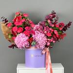Немного фантастики и много розового — этот букет точно не из нашего времени. Как если бы гортензии и бордовые ветки собрались в космическом баре на Марсе.