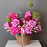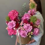 Hydrangea - 2 pcs Celosia - 2 pcs Eucalyptus - 1 pcs Rose - 17 pcs Bush chrysanthemum - 2 pcs Allium - 3 pcs Palm leaf - 4 pcs
