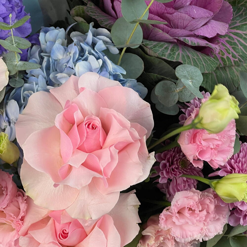 Hydrangea - 1 pcs Delphinium - 2 pcs Lisianthus - 3 pcs Eucalyptus - 1 pcs Rose - 3 pcs Chrysanthemum - 1 pcs Brassica - 1 pcs