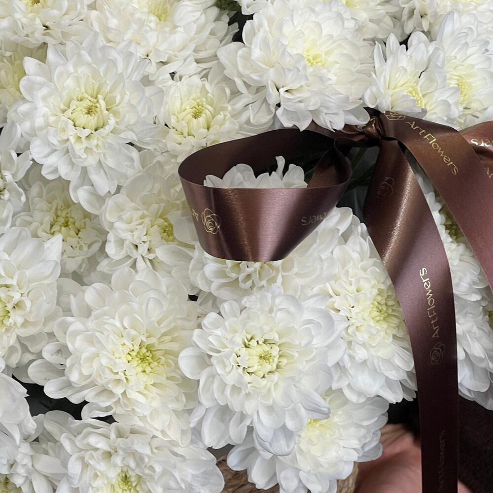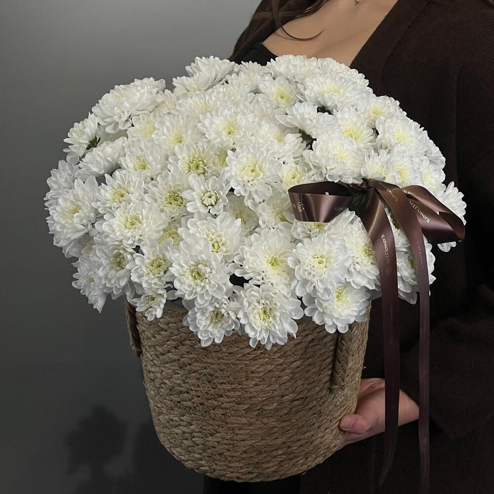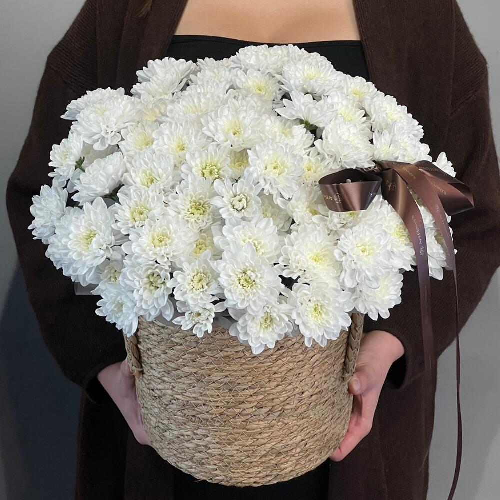 Воздушная композиция из белоснежных хризантем — символ искренности и заботы. Корзина делает букет самодостаточным и универсальным подарком.