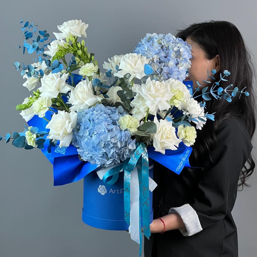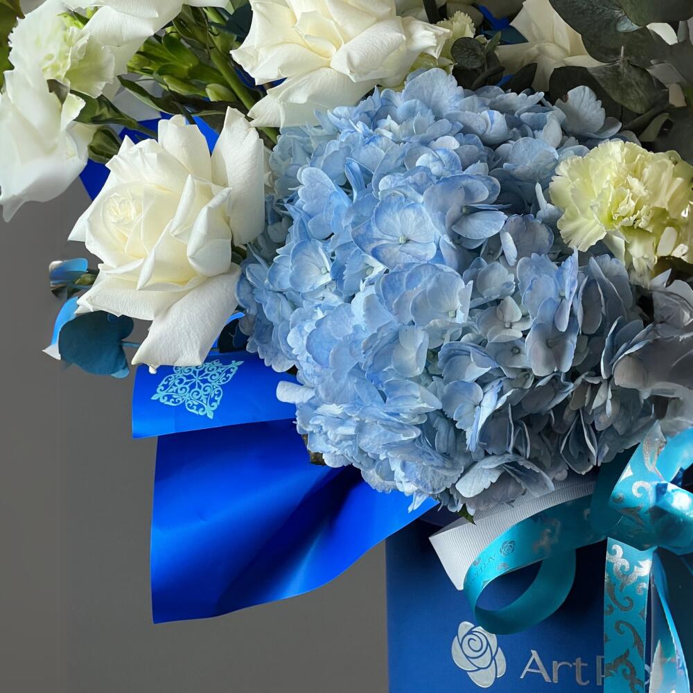 Hydrangea - 2 pcs Eucalyptus - 2 pcs Rose - 18 pcs Chrysanthemum - 2 pcs Carnation - 7 pcs Ornithogalum - 2 pcs