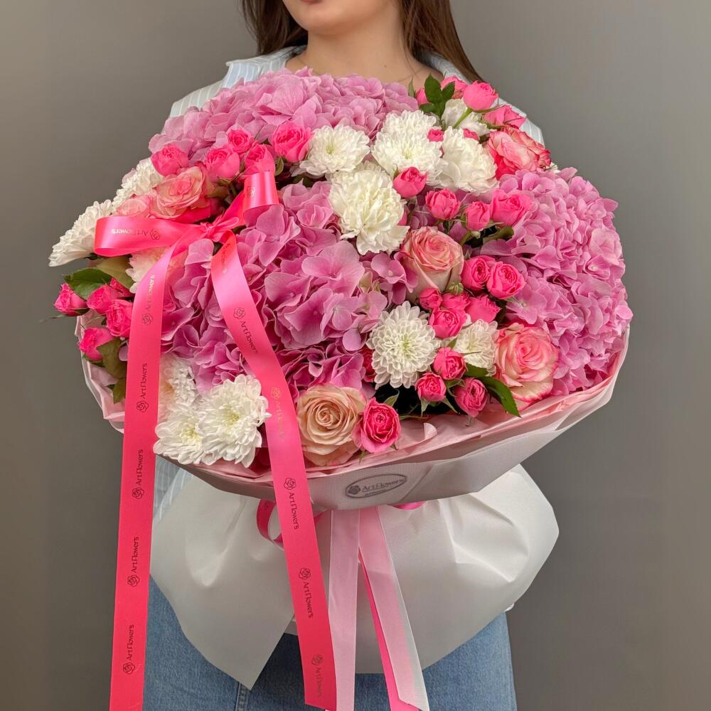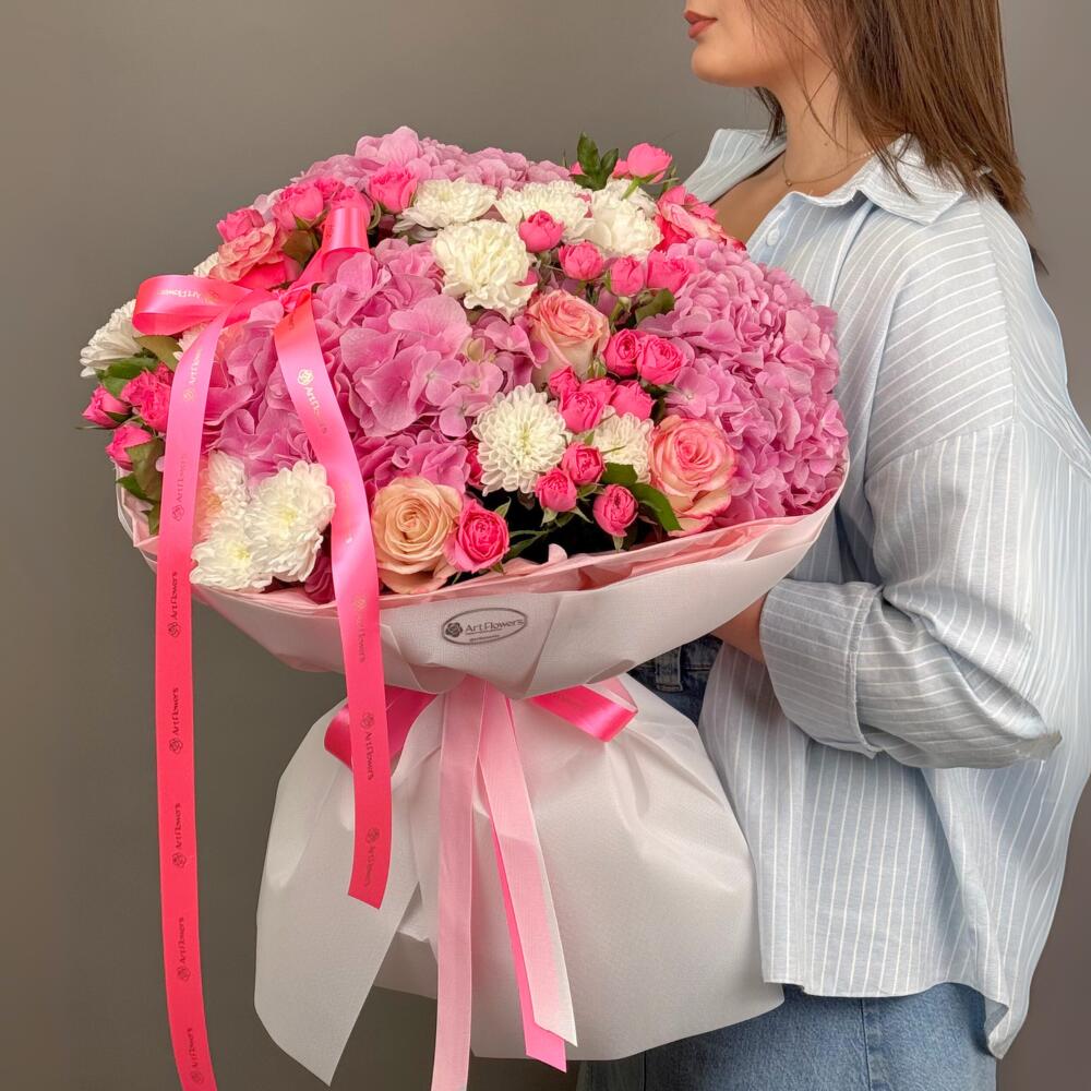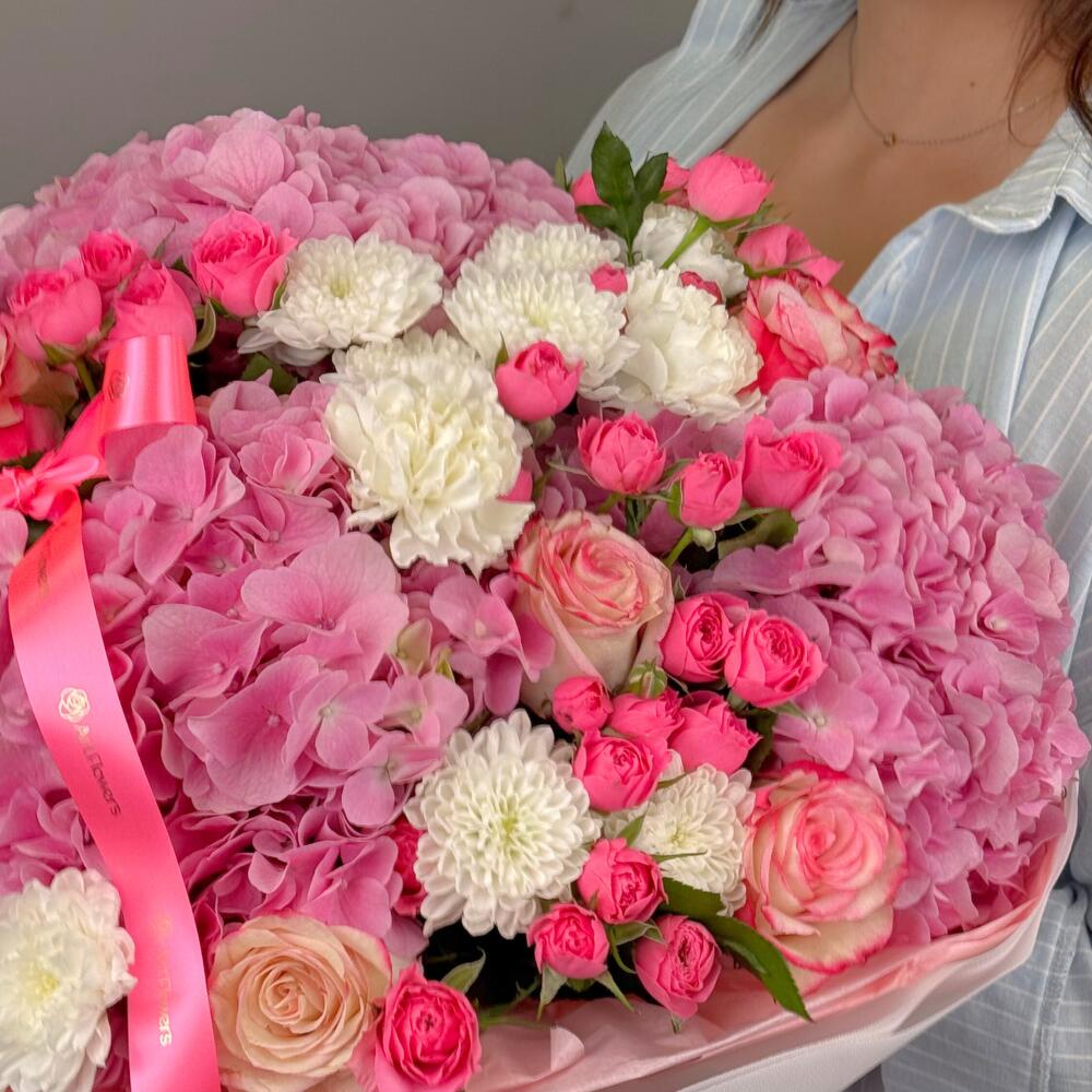 Hydrangea - 3 pcs Rose - 7 pcs Chrysanthemum - 5 pcs rose spray - 5 pcs