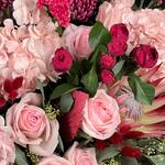 Anthurium - 2 pcs Hydrangea - 4 pcs Protea - 1 pcs Celosia - 3 pcs Chrysanthemum - 7 pcs Lagurus - 1 pcs peony - shaped roses - 6 pcs rose spray - 7 pcs делььфиниум - 4 pcs