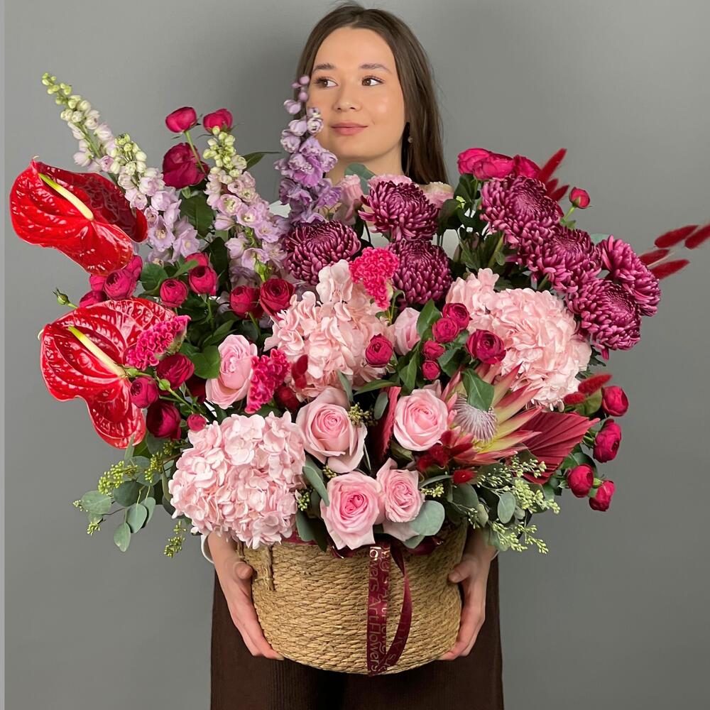 Anthurium - 2 pcs Hydrangea - 4 pcs Protea - 1 pcs Celosia - 3 pcs Chrysanthemum - 7 pcs Lagurus - 1 pcs peony - shaped roses - 6 pcs rose spray - 7 pcs делььфиниум - 4 pcs