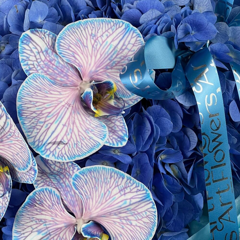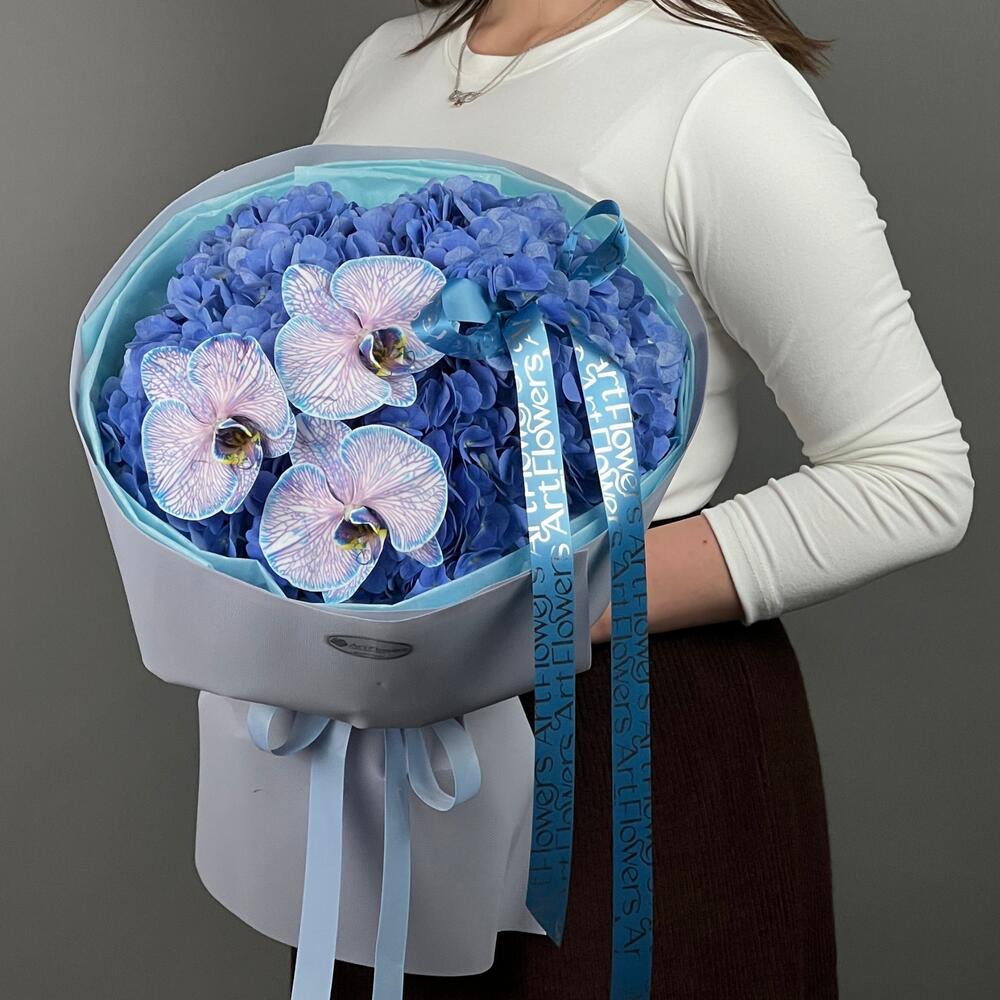 Букет, словно прохладное дыхание утра — лёгкий, воздушный и безмятежный. Нежные оттенки голубого и розового создают настроение спокойствия и гармонии. Идеален для выражения благодарности, нежности и заботы.