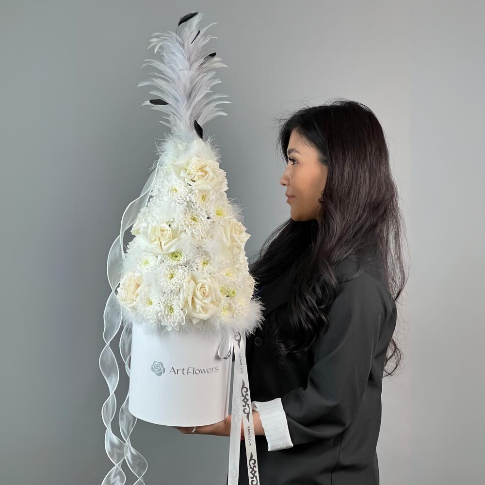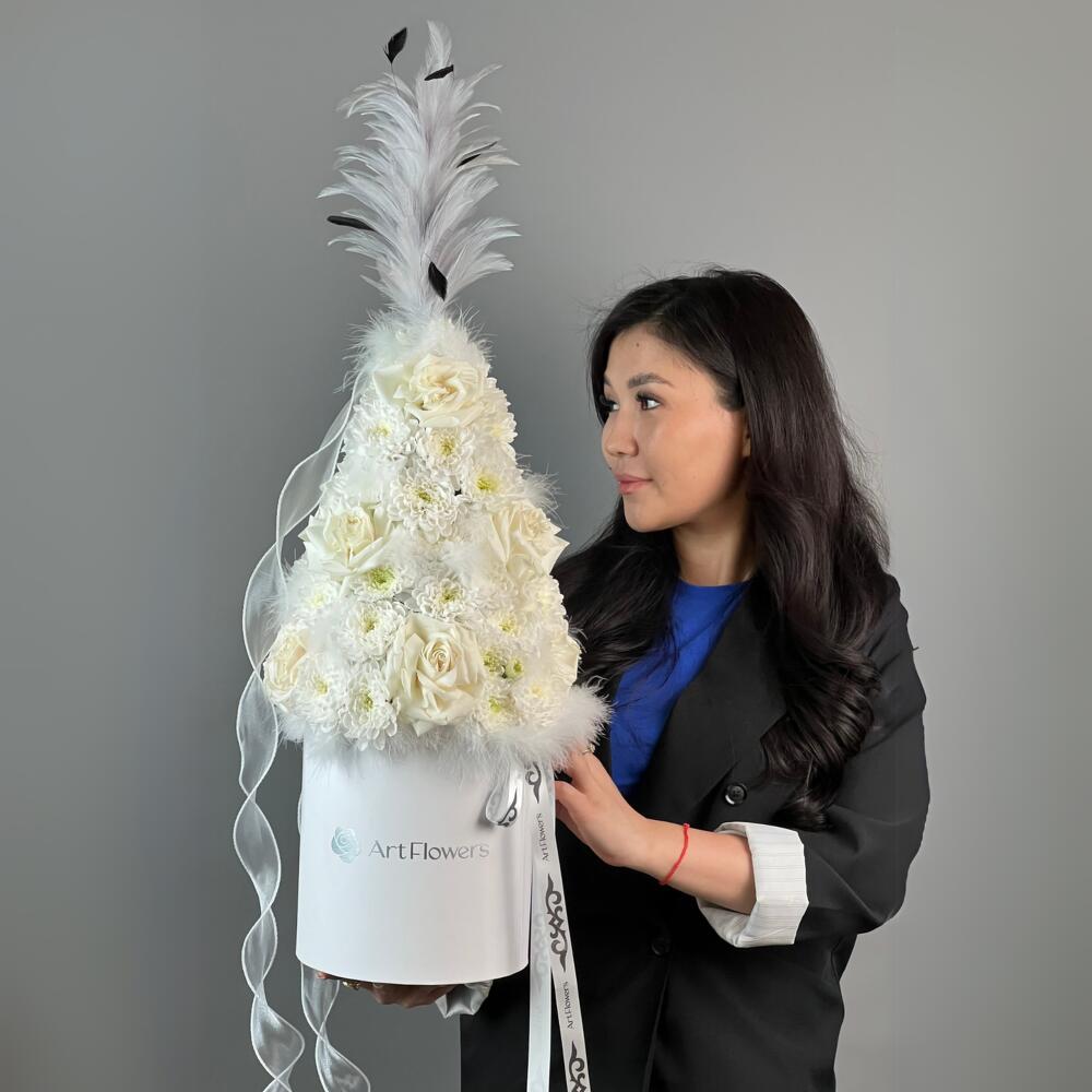 Тончайшая композиция, вдохновлённая величественной красотой казахского национального головного убора — саукеле. Белоснежные розы и нежные хризантемы складываются в форму, напоминающую символ чистоты, новой жизни и благородства. Этот букет словно переносит в мир великих традиций и светлых надежд, наполняя пространство особым теплом и трепетным ожиданием счастья. Идеальный выбор для особых моментов, когда хочется подчеркнуть важность события и передать глубокое уважение к культуре.