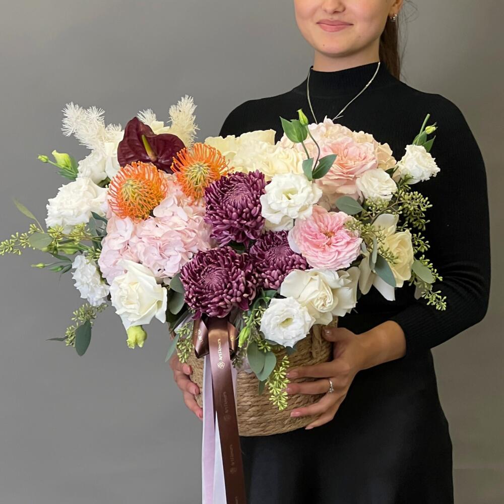 Anthurium - 1 pcs Hydrangea - 2 pcs Lisianthus - 4 pcs Eucalyptus - 1 pcs Rose - 13 pcs Chrysanthemum - 3 pcs Asparagus - 1 pcs peony - shaped roses - 2 pcs leucospermum - 2 pcs