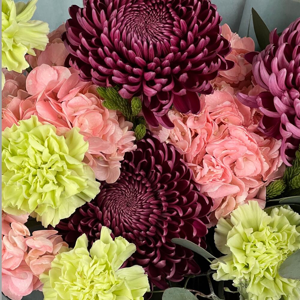 Brunia - 3 pcs Hydrangea - 2 pcs Eucalyptus - 1 pcs Chrysanthemum - 3 pcs Carnation - 7 pcs
