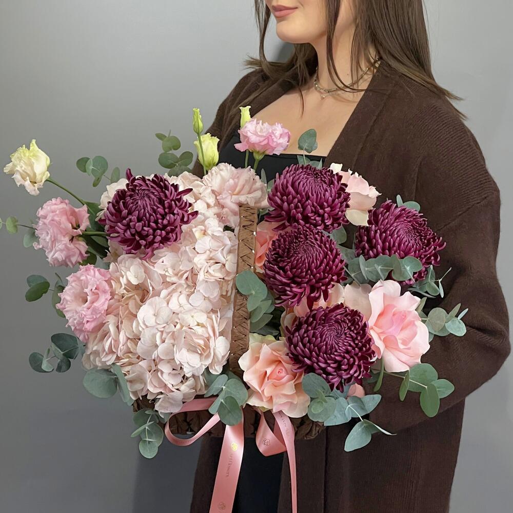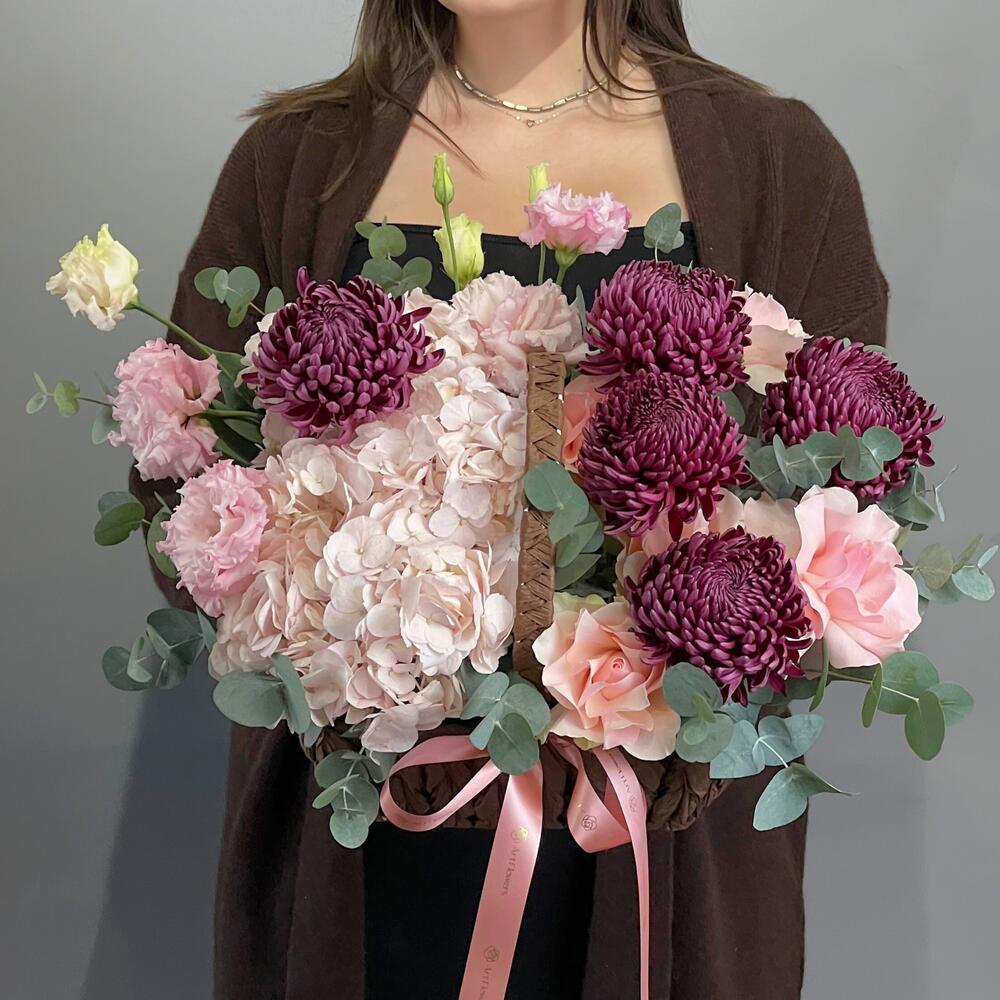 Hydrangea - 3 pcs Lisianthus - 2 pcs Eucalyptus - 1 pcs Rose - 5 pcs Chrysanthemum - 5 pcs