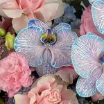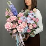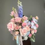 Hydrangea - 2 pcs Delphinium - 2 pcs Lisianthus - 4 pcs Limonium - 1 pcs Eucalyptus - 1 pcs Rose - 11 pcs orchid - 3 pcs