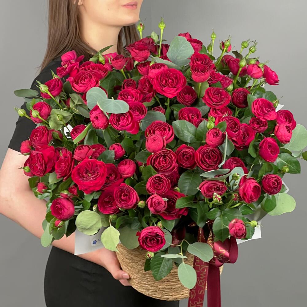 Изящная композиция в корзине, где бордовая спрей-роза обрамлена ароматным эвкалиптом. Это не просто цветы — это готовая атмосфера для дома или офиса: стильная, уютная и благородная.