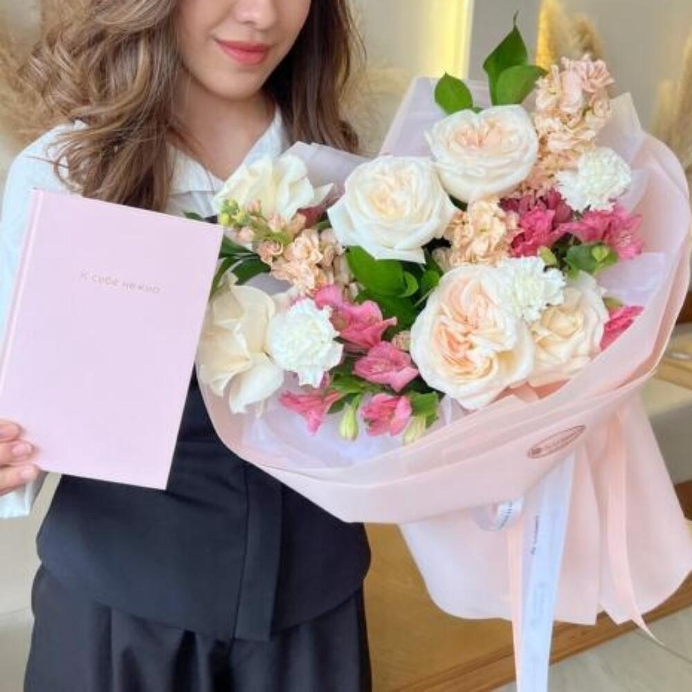 Изысканный букет, словно первые лучи солнца — мягкие оттенки розового и белого дарят тепло и нежность. Подари это очарование особенной девушке! Серия К себе нежно блокнот в подарок)