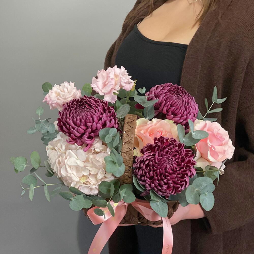 Hydrangea - 1 pcs Lisianthus - 1 pcs Eucalyptus - 1 pcs Rose - 2 pcs Chrysanthemum - 3 pcs