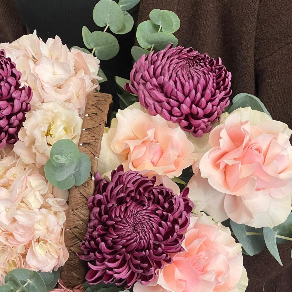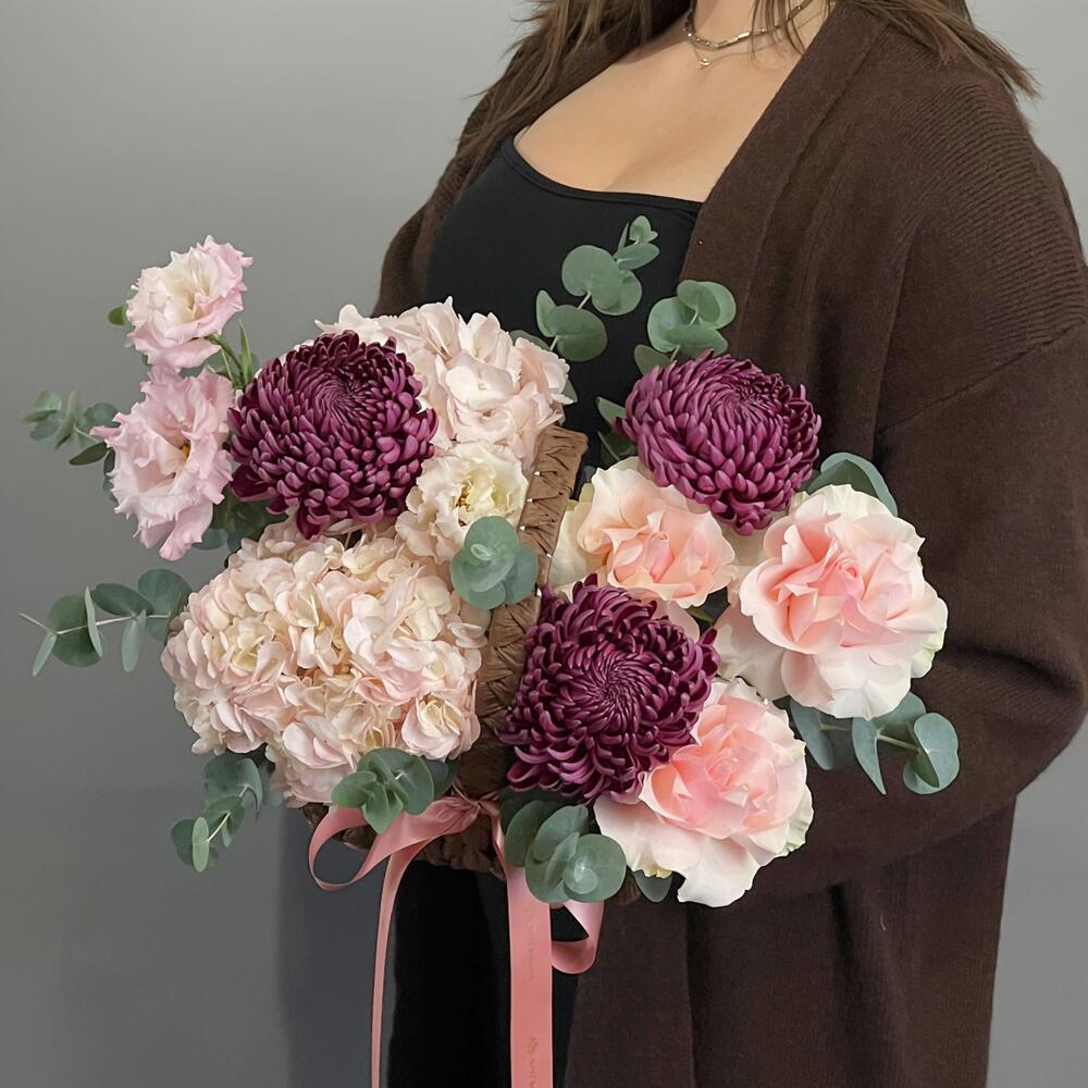 Hydrangea - 2 pcs Lisianthus - 1 pcs Eucalyptus - 1 pcs Rose - 3 pcs Chrysanthemum - 3 pcs