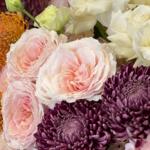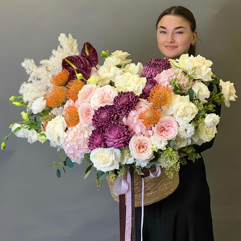 Anthurium - 3 pcs Hydrangea - 5 pcs Lisianthus - 10 pcs Eucalyptus - 4 pcs Rose - 35 pcs Chrysanthemum - 7 pcs Asparagus - 1 pcs peony - shaped roses - 7 pcs leucospermum - 7 pcs