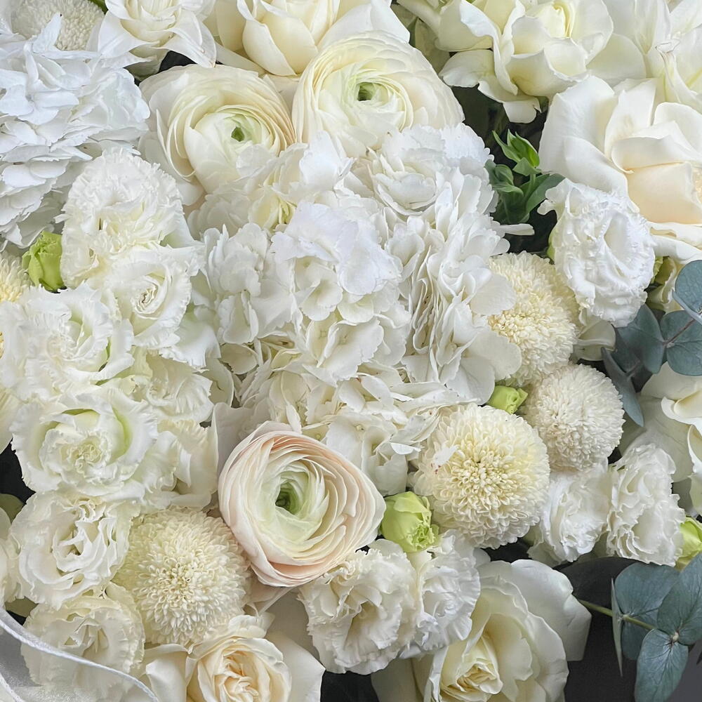 Hydrangea - 5 pcs Lisianthus - 13 pcs Rose - 25 pcs Ranunculus - 4 pcs Momoko Chrysanthemum - 11 pcs