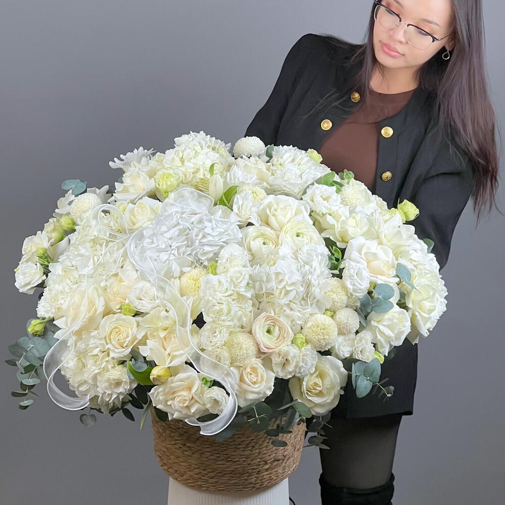 A voluminous arrangement in a light color palette looks festive and stately. White emphasizes purity and versatility, and the shape makes the bouquet expressive.